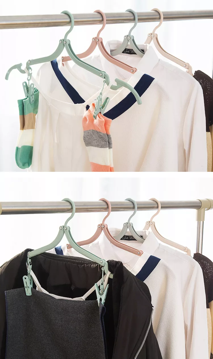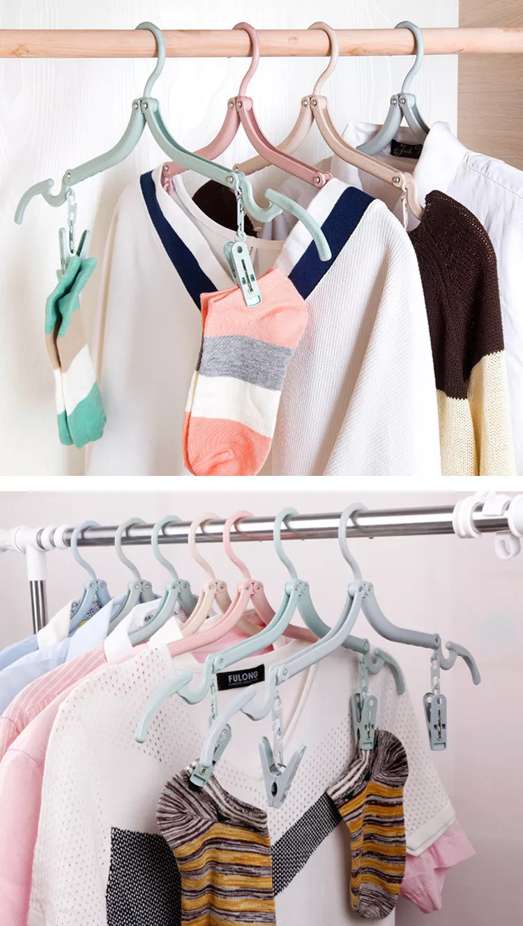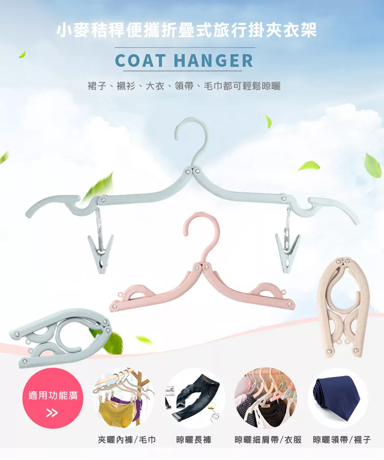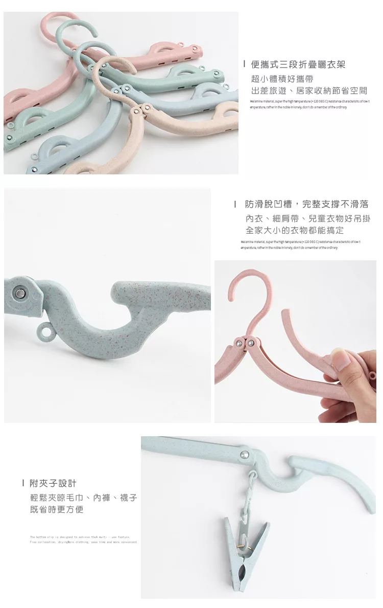 新款「小麥秸稈便攜折疊式旅行掛夾衣架」附夾子設計,需要時快速勾上,輕鬆夾晾毛巾、內褲、襪子,既省時更方便