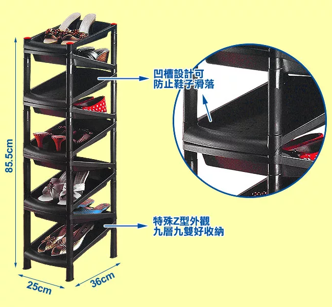 1.九層雙面鞋架採用Z型隔層設計,增加收納空間!